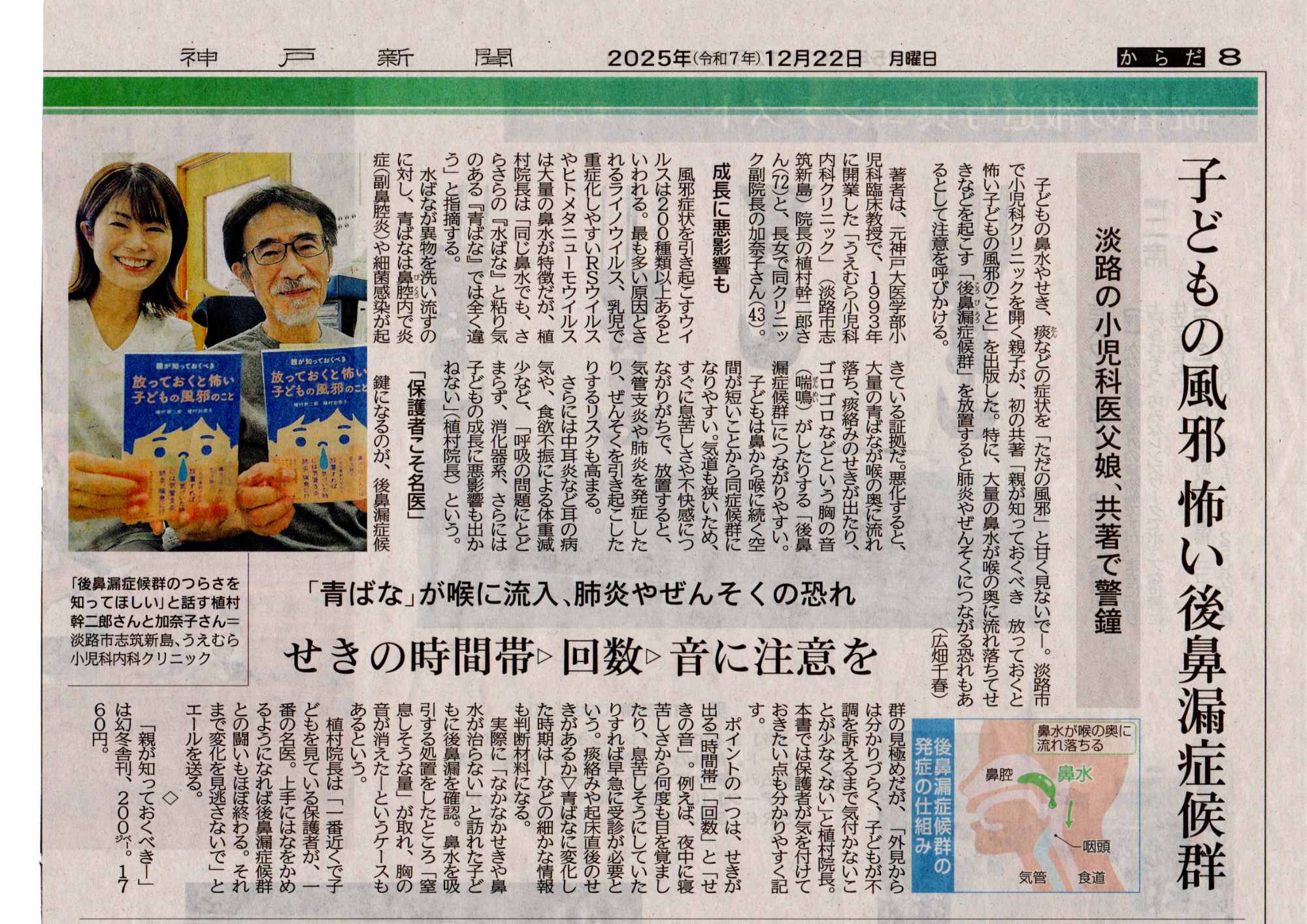 12月22日の神戸新聞の朝刊に、出版本【放っておくと怖い子どもの風邪のこと】に関する取材記事が掲載されました。